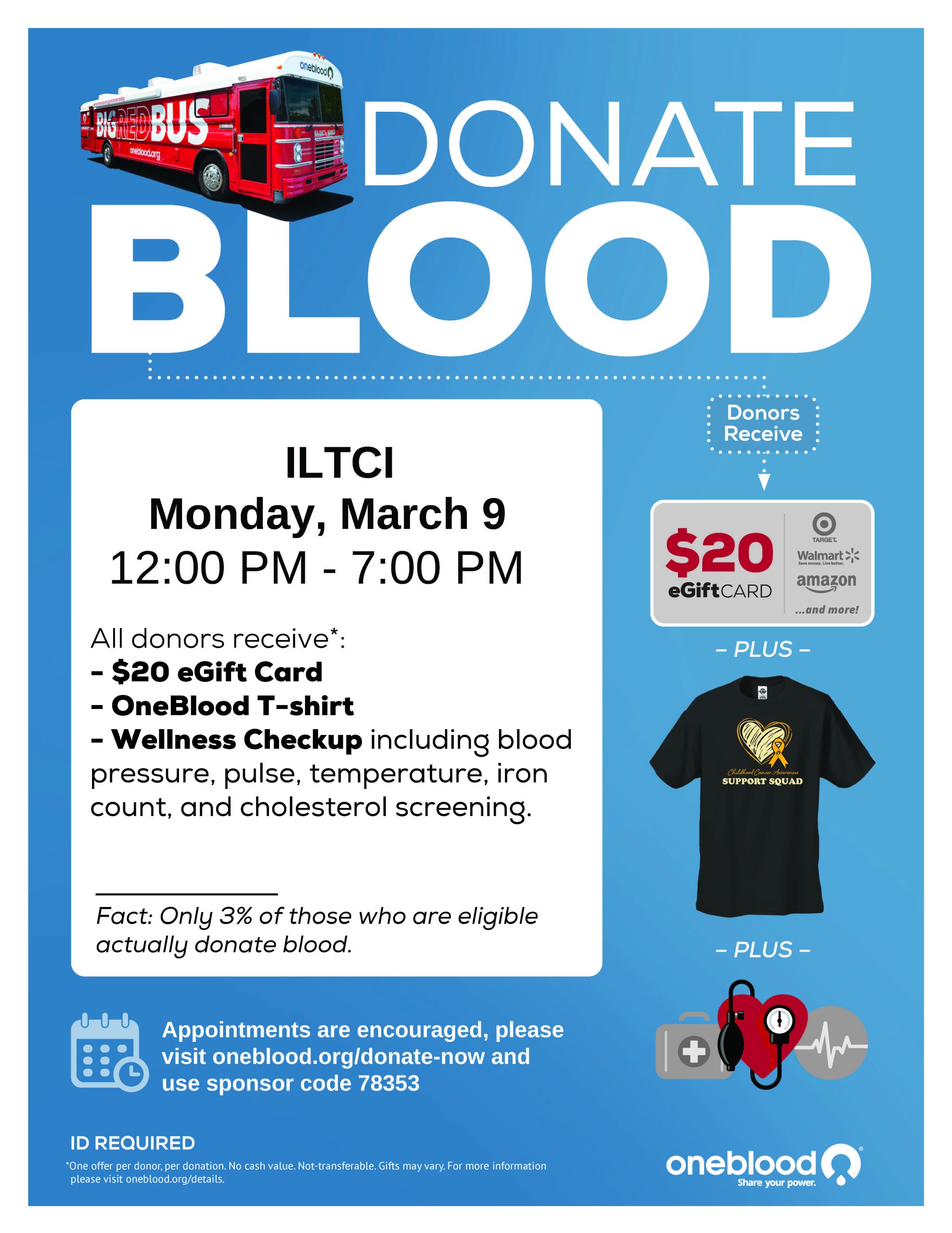 Click Here to Donate Blood at ILTCI on March 9th from 12PM to 7 PM